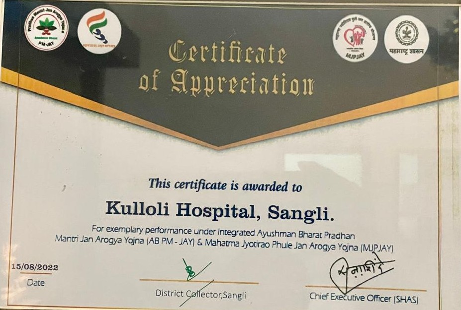 Kullolli Hospital, Sangli, received a Certificate of Appreciation for exemplary performance under Ayushman Bharat – Pradhan Mantri Jan Arogya Yojana (AB PM-JAY) and Mahatma Jyotirao Phule Jan Arogya Yojana (MJPJAY).